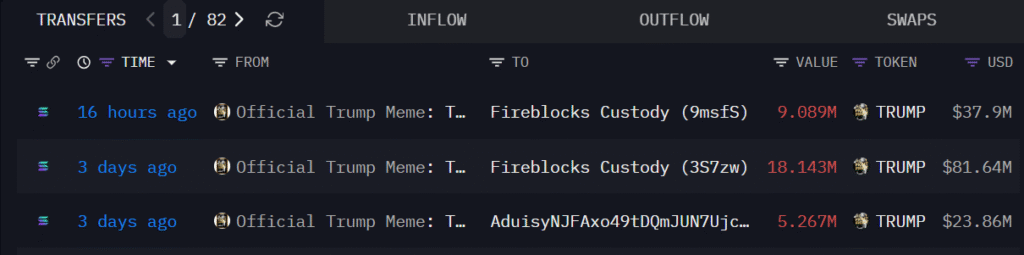 Alongside the price weakness, on-chain data shows notable movements from the Official Trump Meme wallet in recent days. Around 9.08 million TRUMP tokens (~$37.9 million) were transferred to Fireblocks Custody about 16 hours ago, following earlier transfers of 18.14 million TRUMP (~$81.6 million) and 5.26 million TRUMP (~$23.8 million) three days ago.