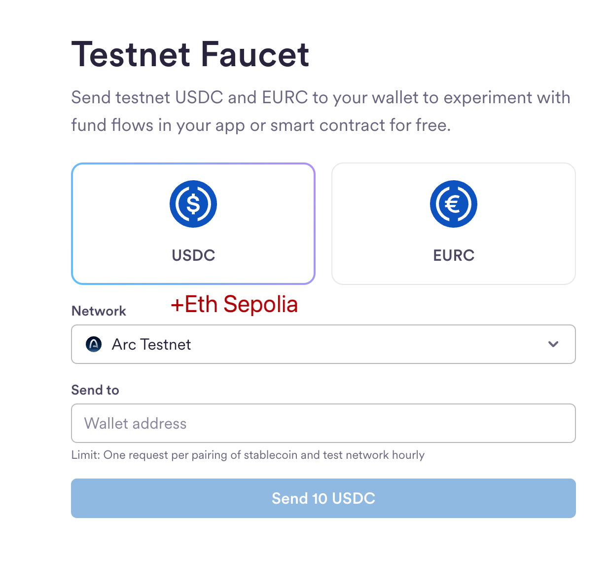 1. Запросите тестовые токены USDC и EURC в тестовых сетях Arc и Ethereum Sepolia из крана: