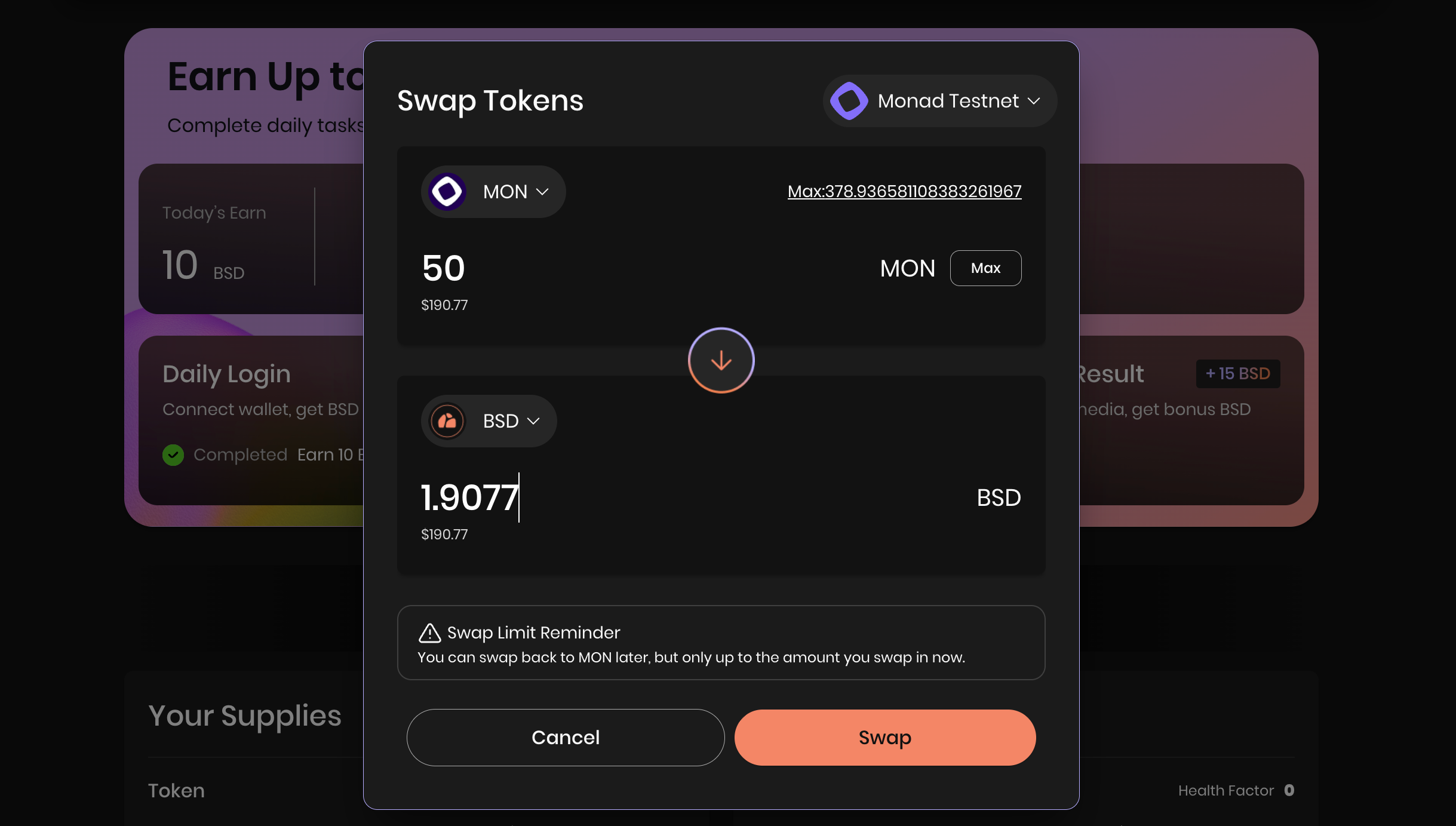 3. После этого в дашборде вы можете приглашать друзей, делать свапы и собирать ежедневно поинты. Свапните сначала MON на BSD, а затем купите акции за BSD: