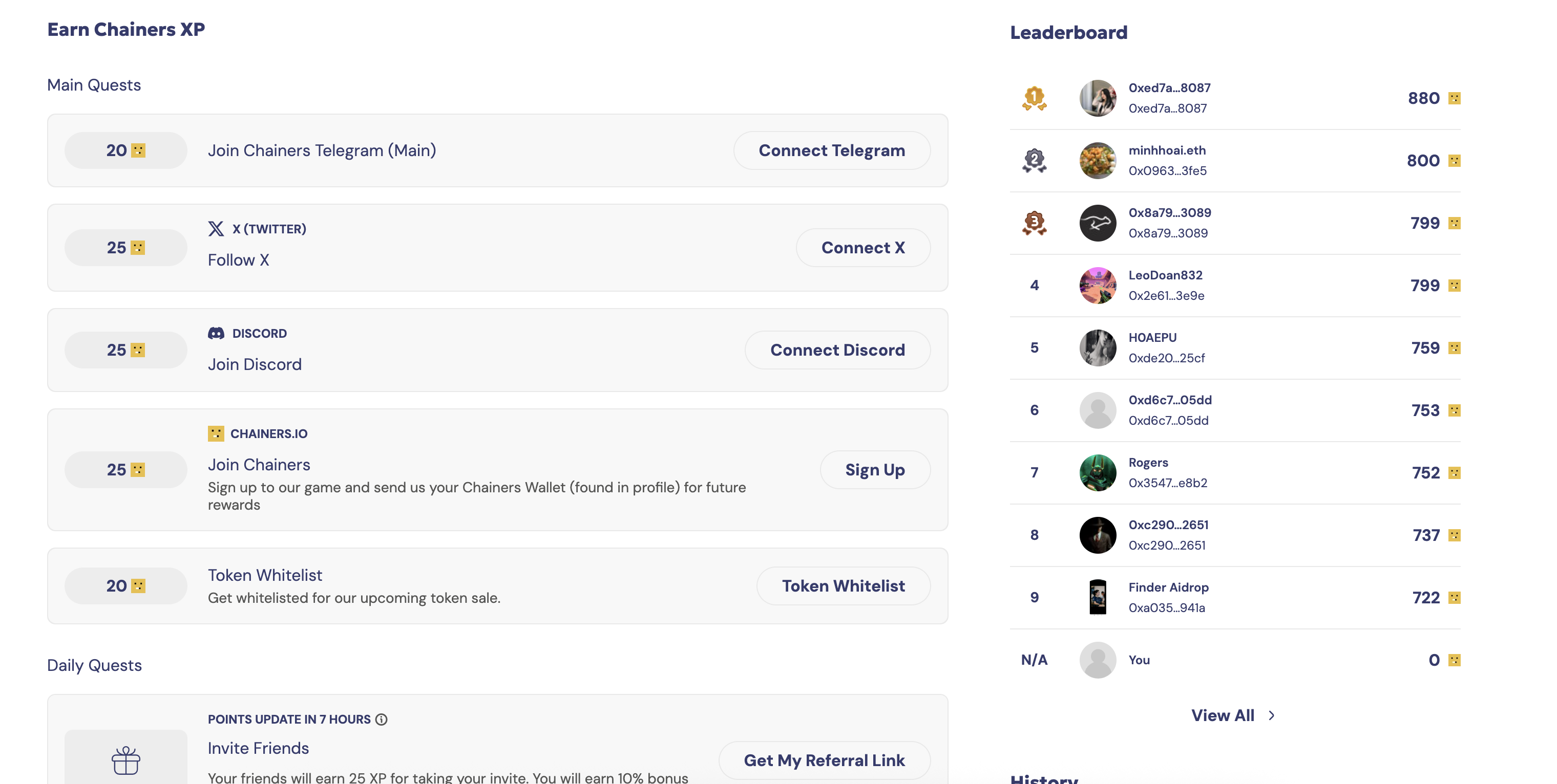 Выполняйте задания, чтобы претендовать на потенциальные аирдропы и награды Chainers. Следуйте пошаговым инструкциям и отслеживайте обновления и статусы задач, чтобы стать одним из потенциальных получателей Chainers Аирдроп.
