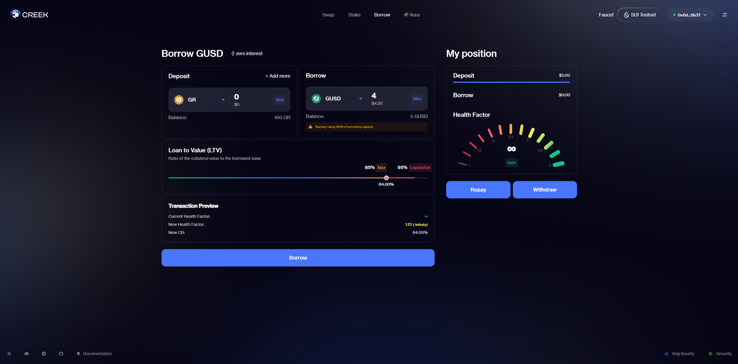 4. Используйте займы в разделе Borrow. Сделайте депозит и возьмите взаймы GUSD. Используйте Repay и Withdraw.