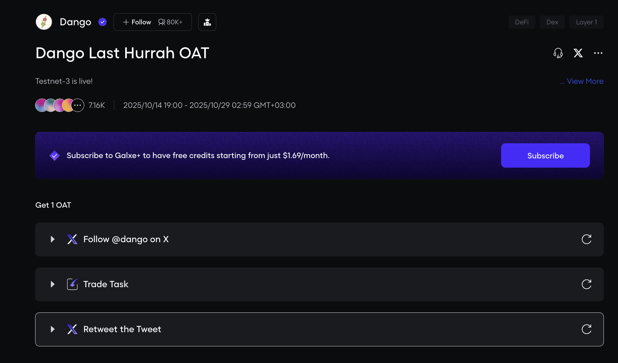 Помимо тестнета-3, Dango запустили кампанию на Galxe. Обязательно заклеймите OAT после того как сделали $6.9M торгового объема!