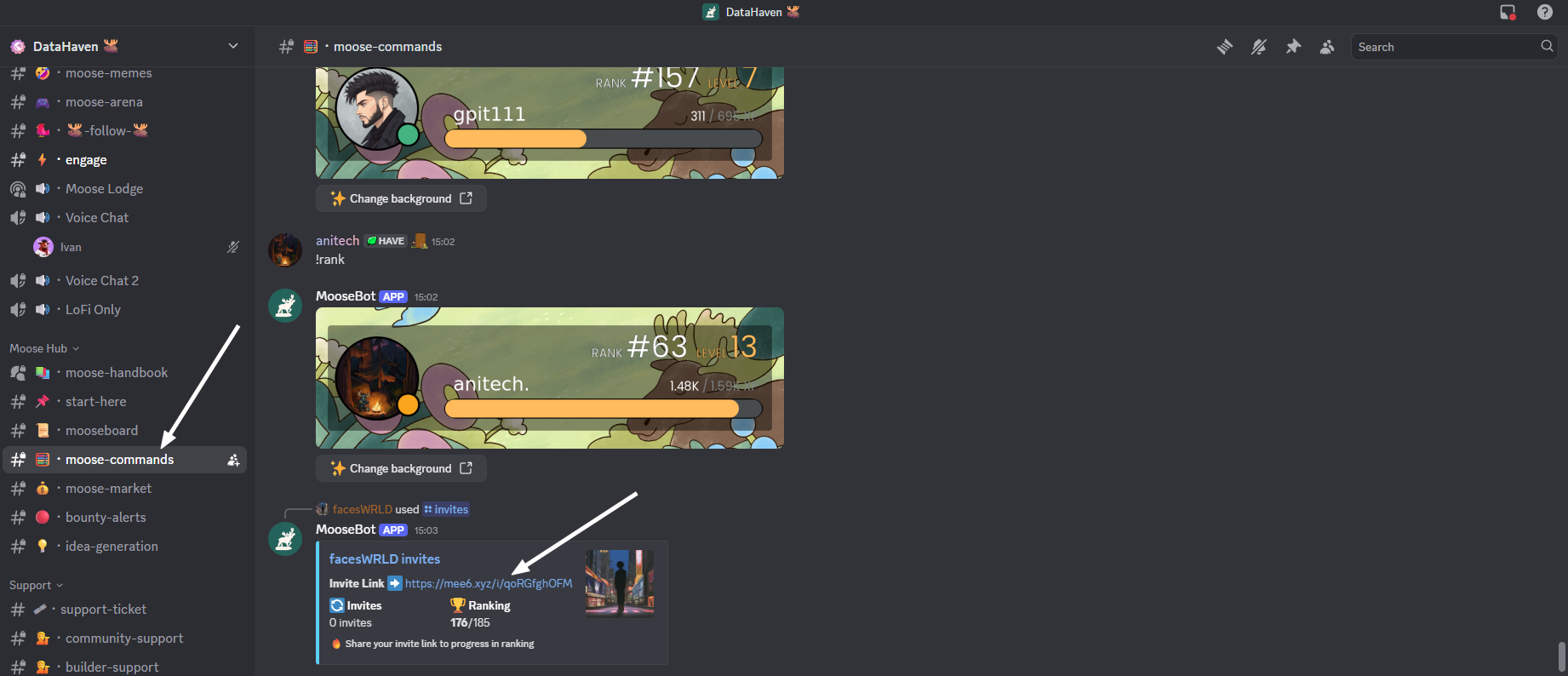 4. Перейдите в канал #moose-commands и наберите команду /invites. Вы увидите свою реферальную ссылку и статистику по приглашениям.