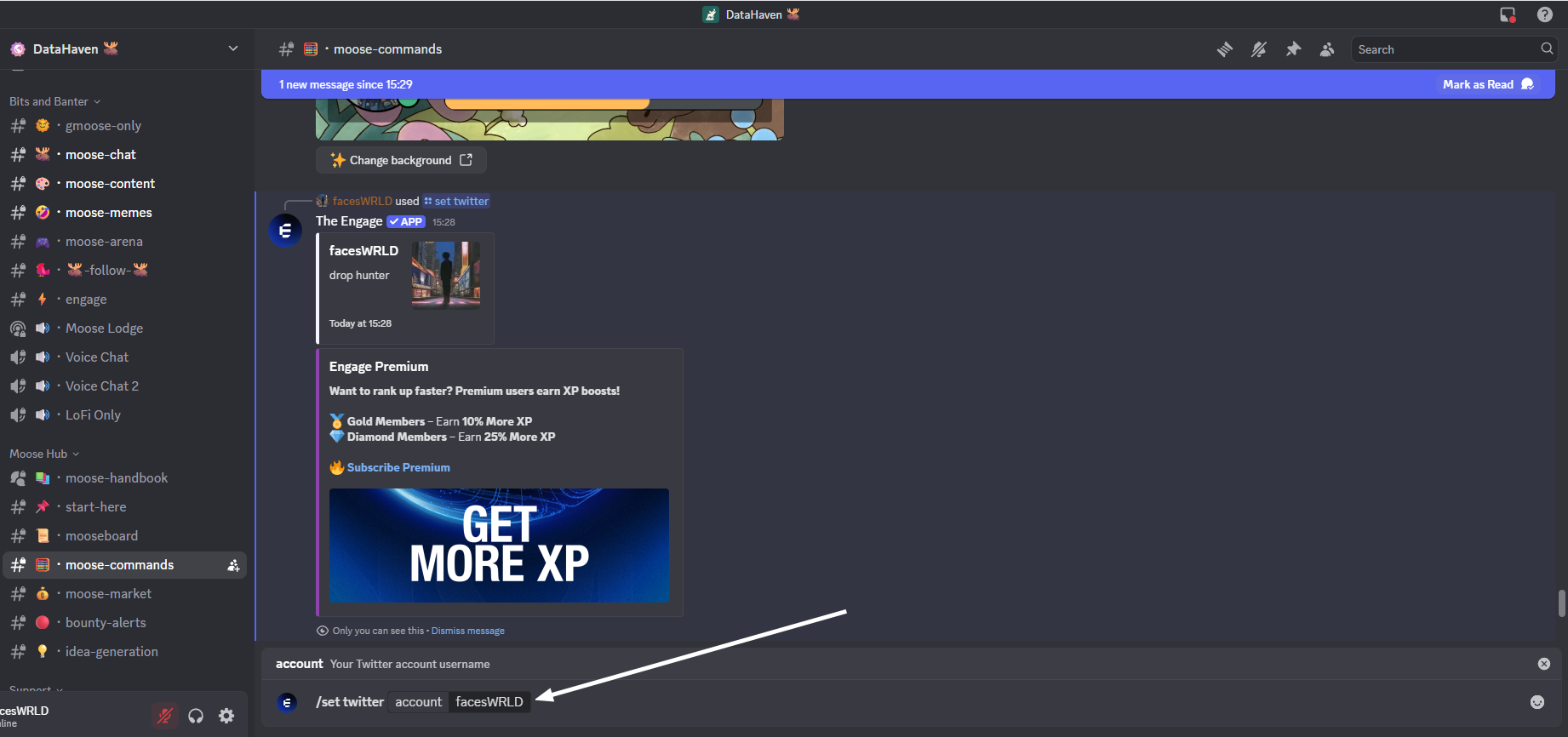 5. В этом же канале наберите команду /set twitter ваш_юзернейм, например — /set twitter turrizt. С помощью команды /coins можно узнать количество своих Moose Keys. Команда /rank позволяет узнать свой уровень в Discord.