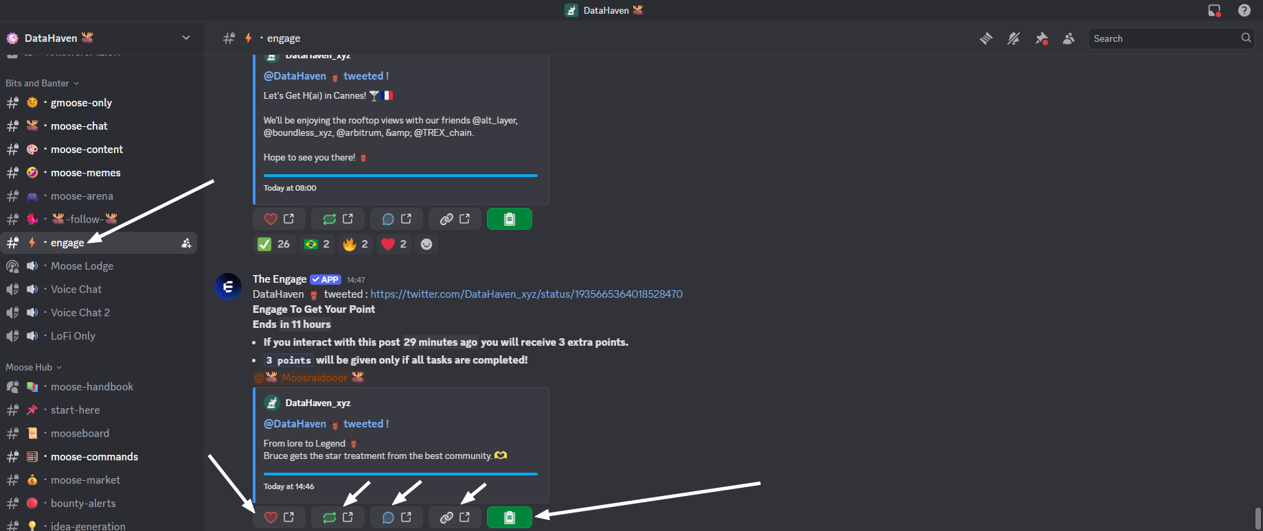 6. Перейдите в канал #engage и начните взаимодействовать с постами в X (ex-Twitter). Нажимайте на иконки лайка, ретвита и комментария, чтобы выполнить действия. С помощью самой правой зелёной кнопки можно проверить выполнение всех условий. Проверяйте канал ежедневно.