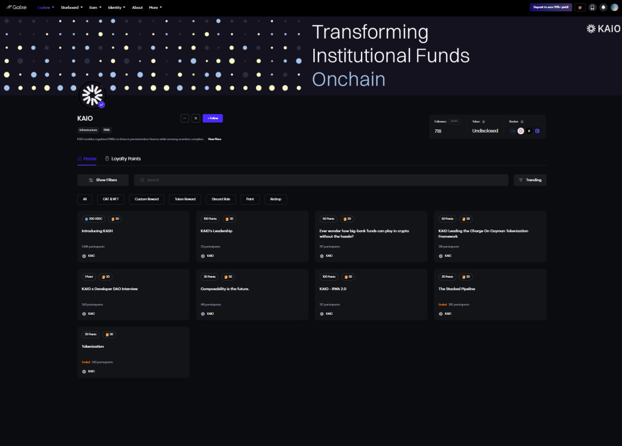 На платформе Galxe доступны различные социальные кампании. Вы можете пройти их и заработать поинты, которые в дальнейшем могут повлиять на доступ к продуктам KAIO и возможным наградам