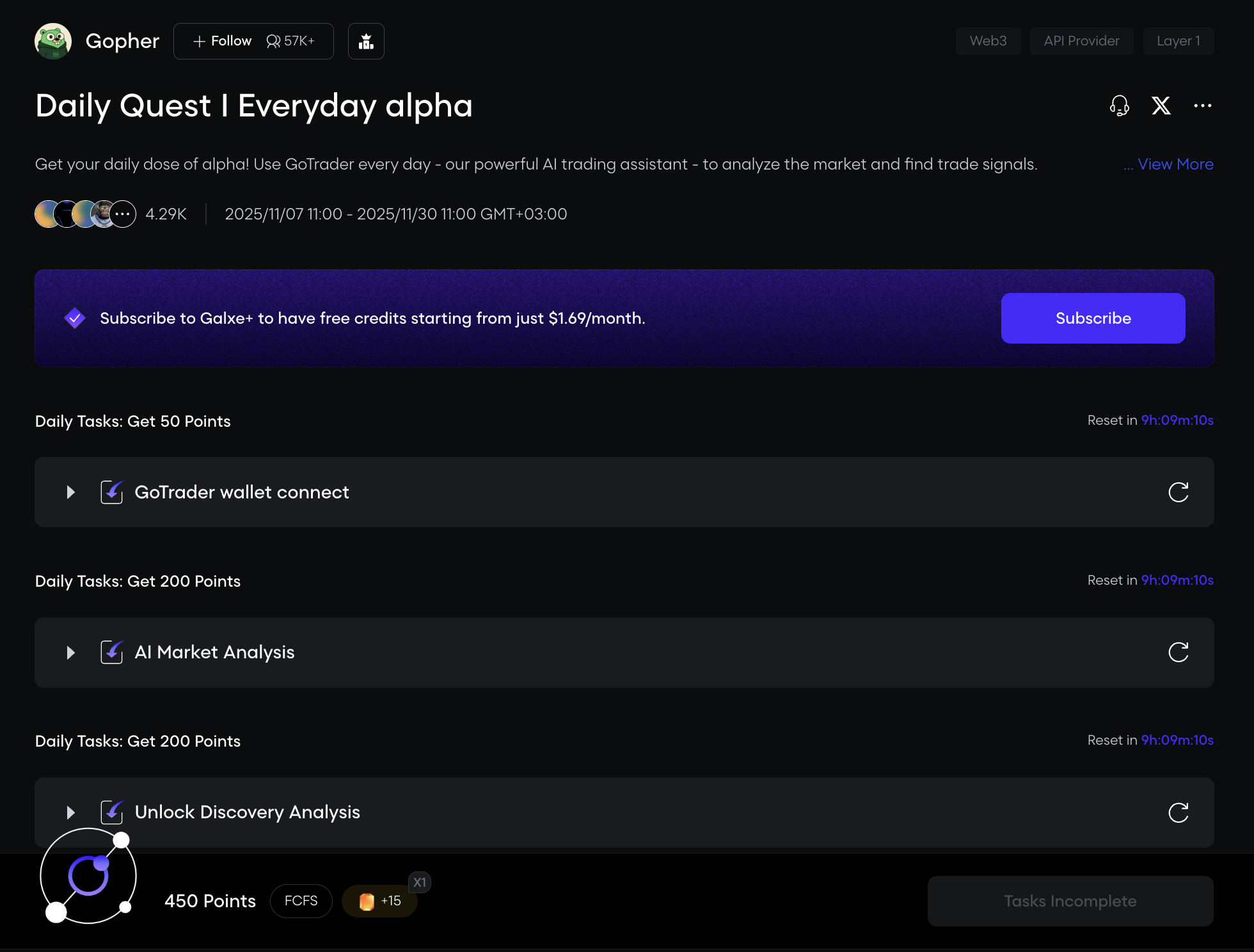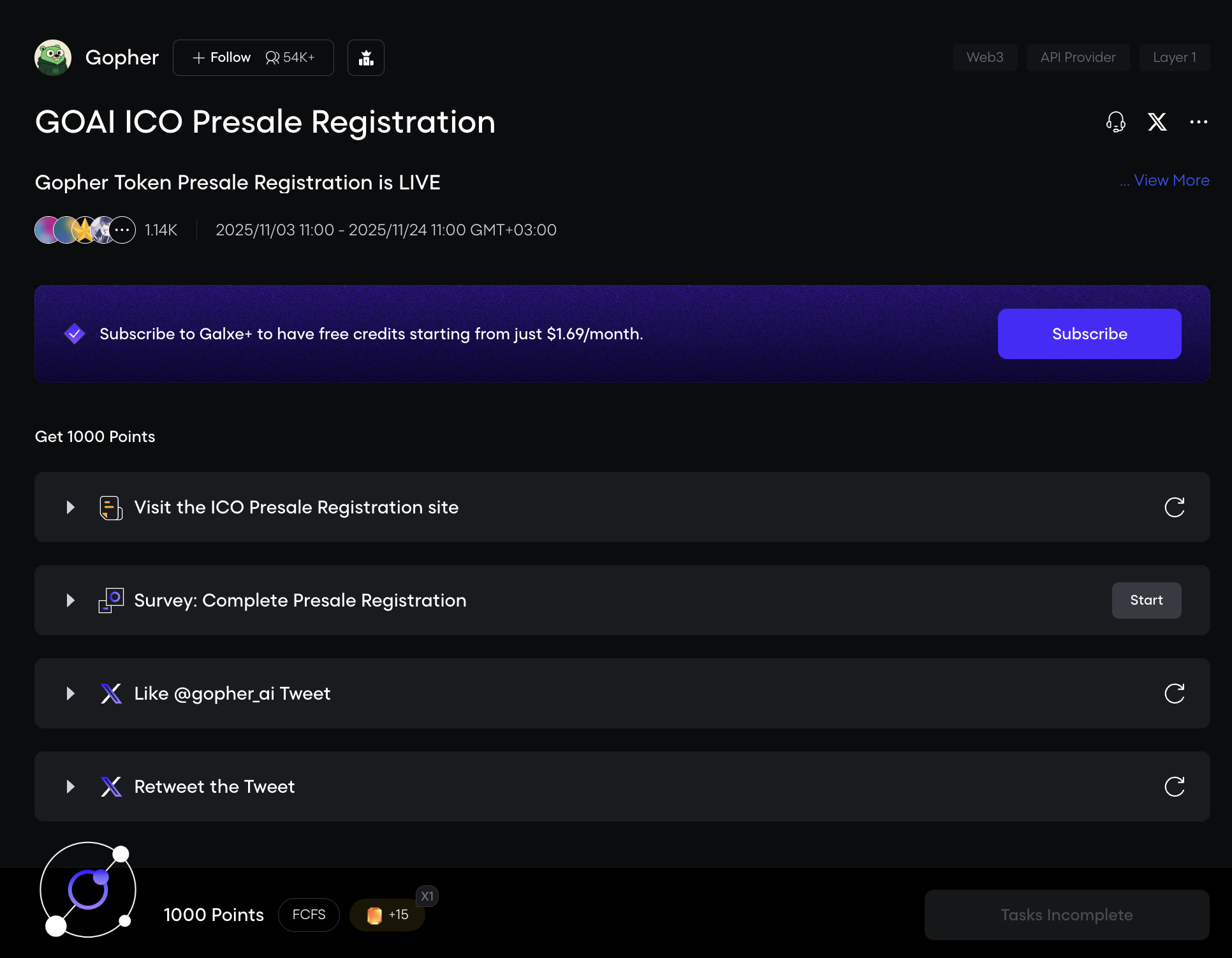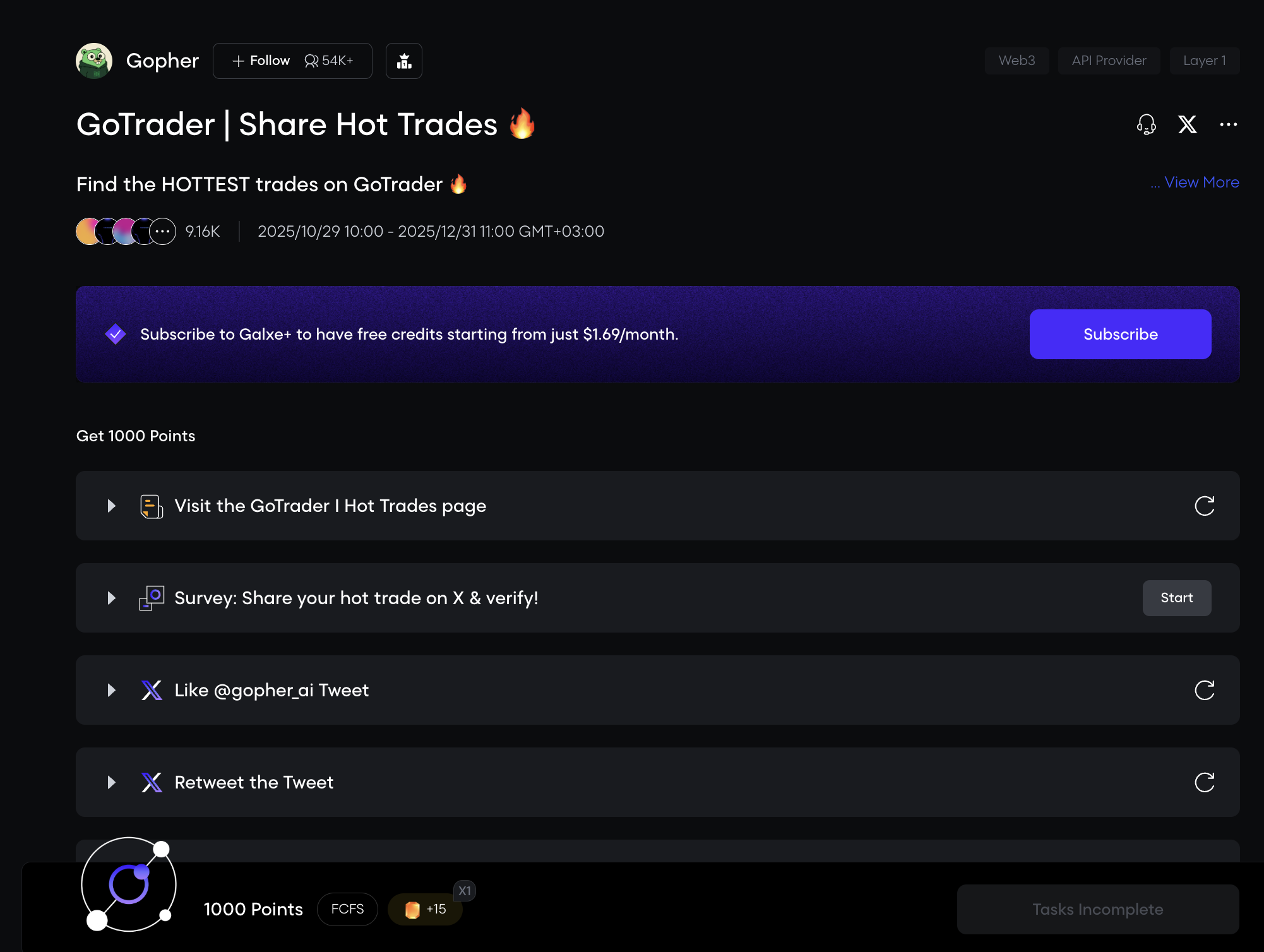 Помимо тестнета, у Gopher активна кампания на Galxe. Выполните задания и заработайте Galxe Points.