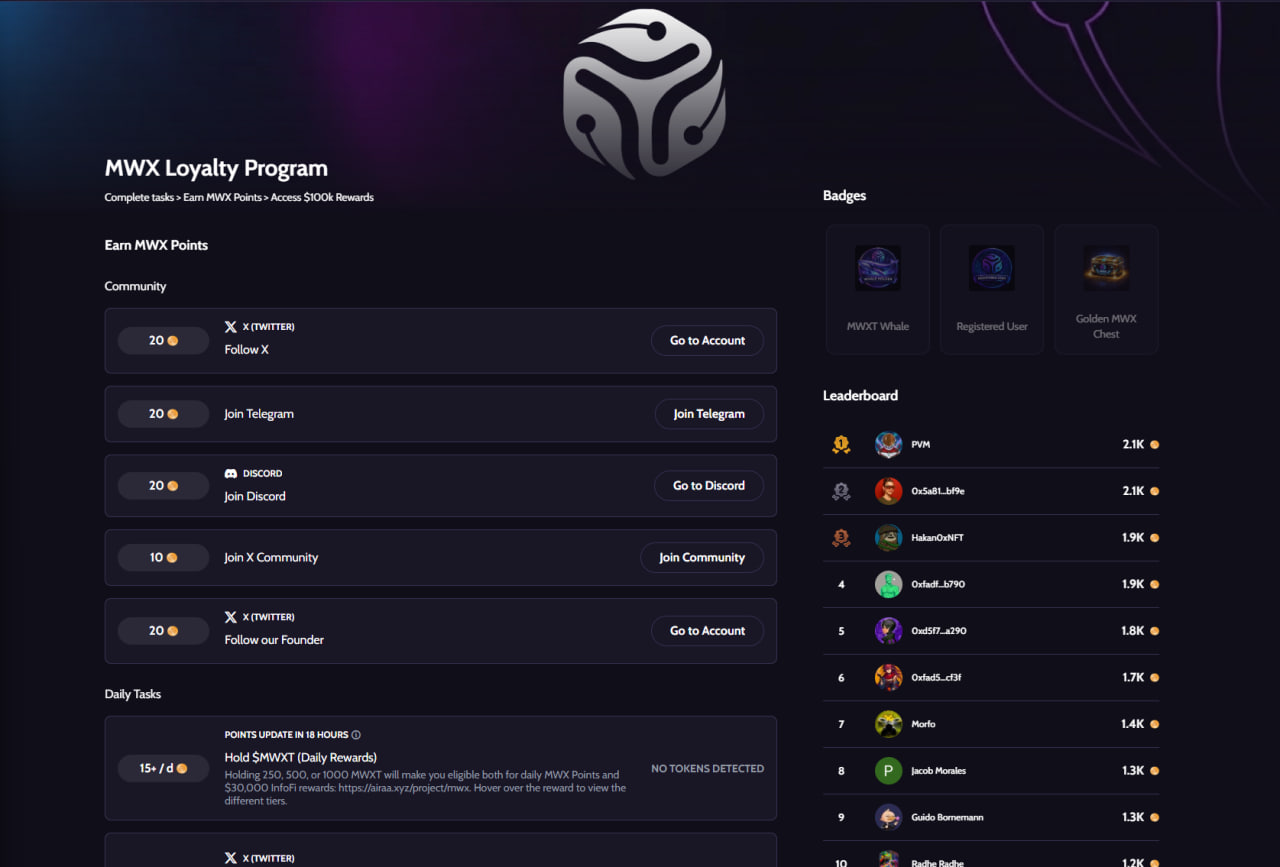 MWX объявили о запуске программы лояльности. Вы можете принять участие, выполняя социальные задания и удерживая токены $MWXT, зарабатывая дополнительные поинты и бейджи.