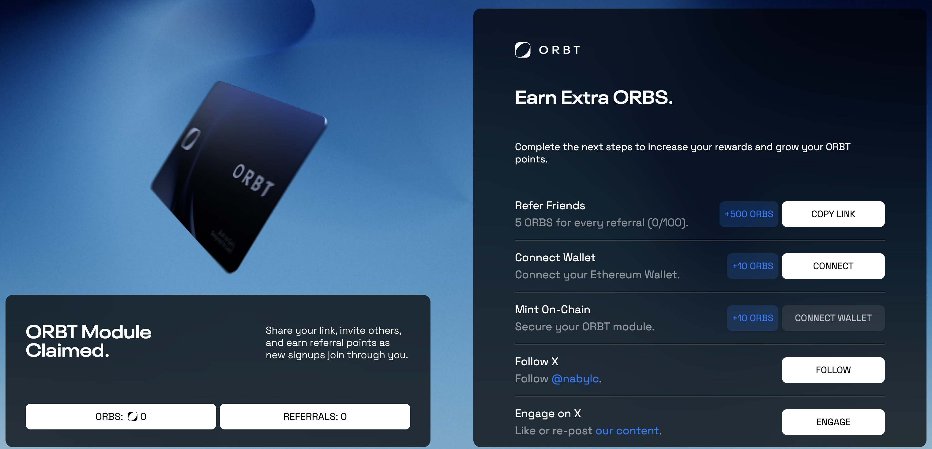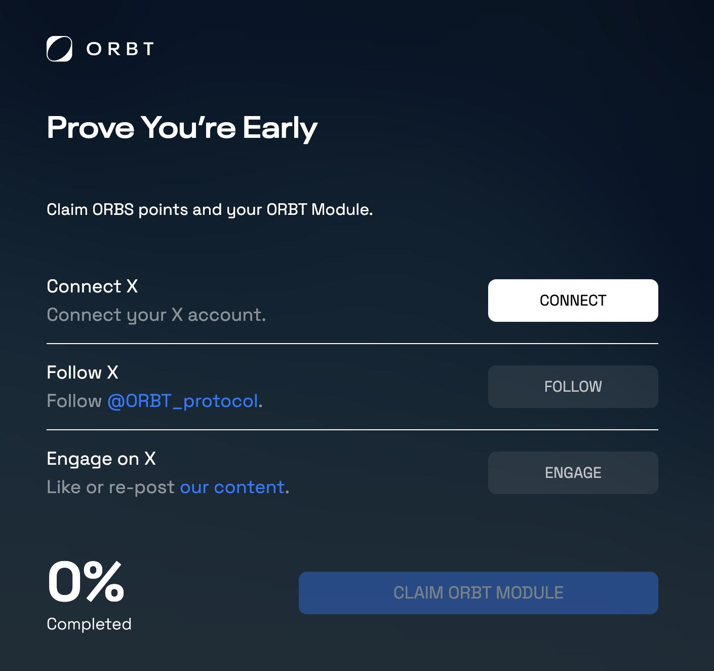 ORBT анонсировали клейм модуля и фарм ORBS (поинтов) перед запуском протокола. Мы можем выполнить простые задания, забрать модуль и заработать поинты. Возможно, в будущем это даст преимущество перед другими пользователями.