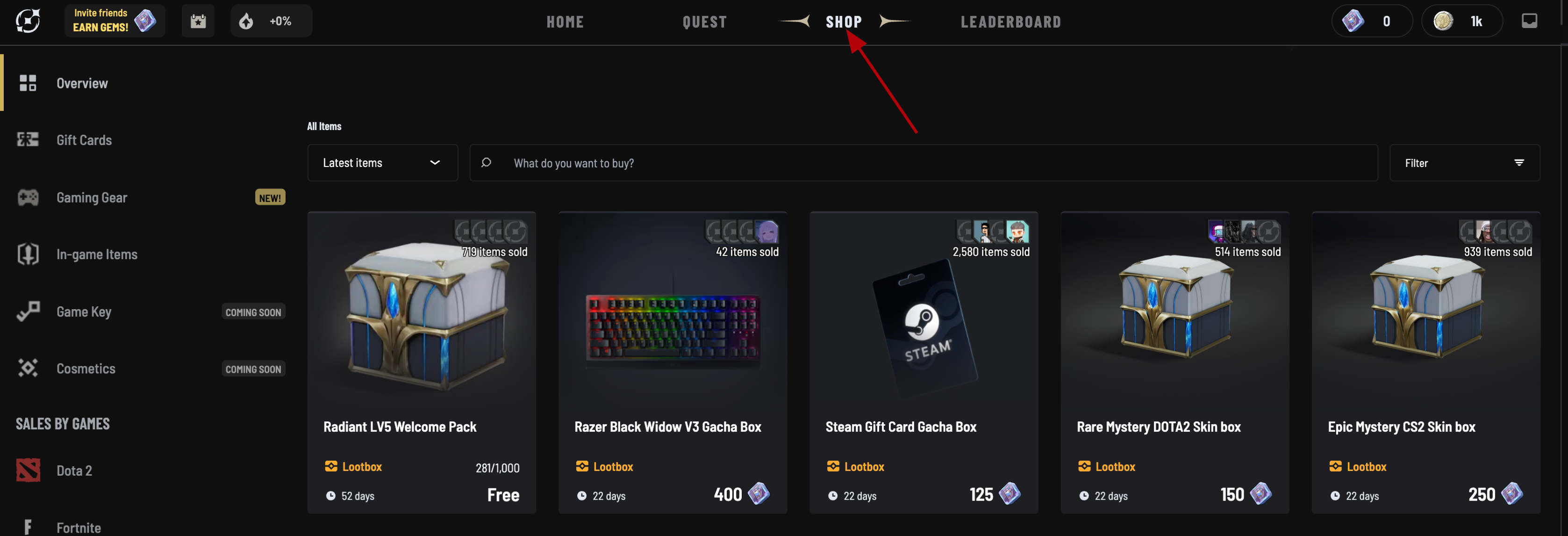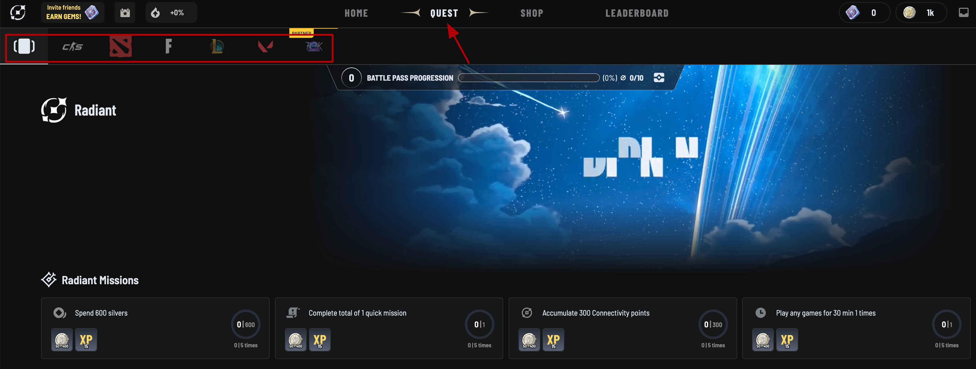 2. Пройдите обучение и откройте вкладку Quests. Здесь вы можете выполнять игровые задания в популярных играх: