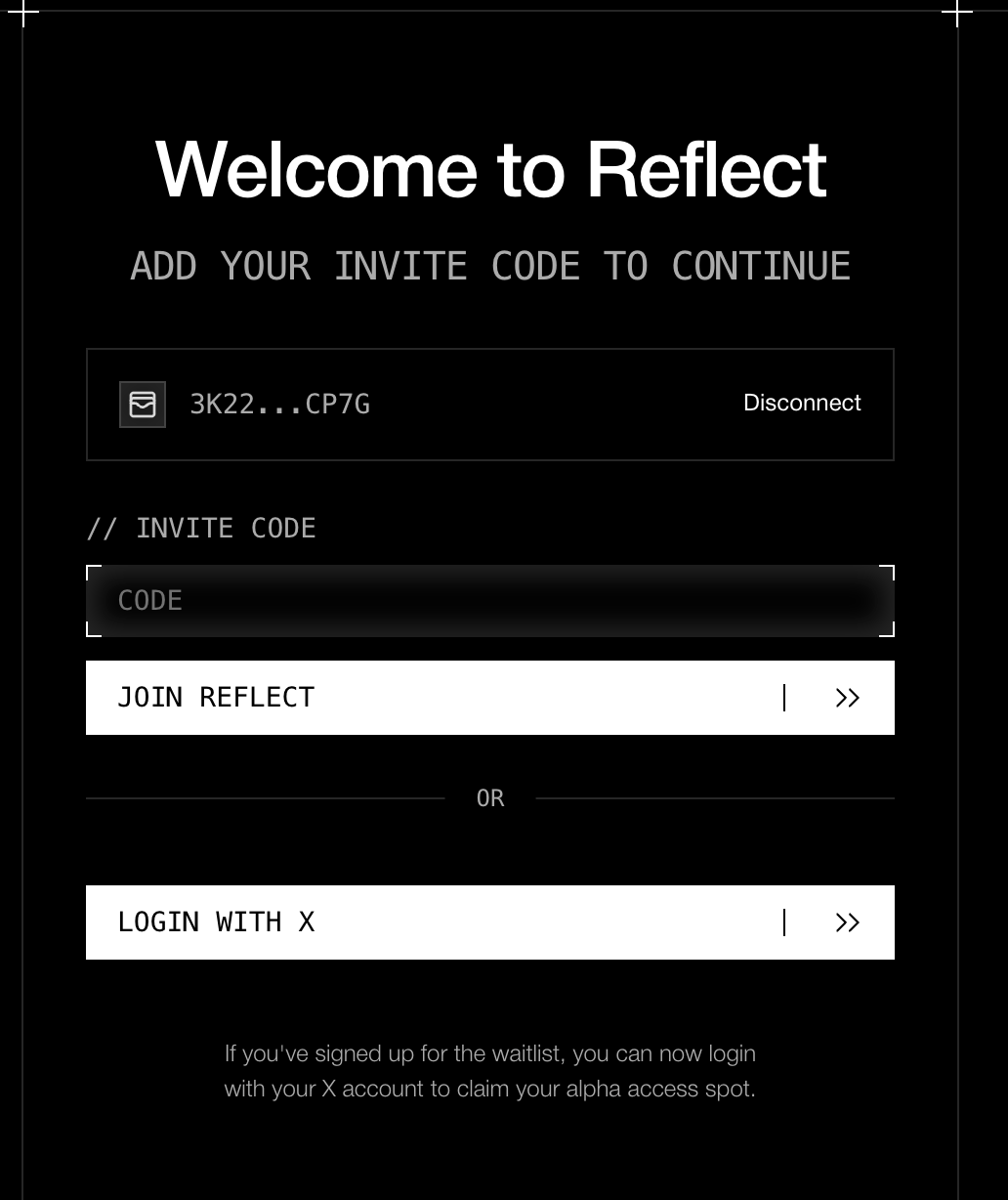 1. Перейдите на сайт, подключите кошелек Solana и введите код доступа. Вы можете использовать один из этих: T9GSRBGV, V6S88SK1, 2GP02NGB или найти их в X. Через некоторое время наши пользователи поделятся своими кодами используя хештег #crreflectcode: