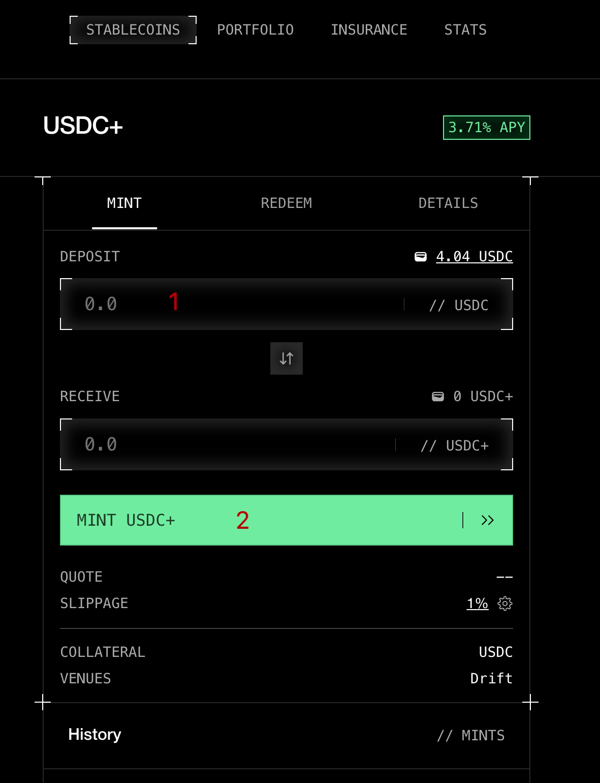 2. Сминтите стейблкоин USDC+ и начните зарабатывать поинты. Больше сумма депозита - больше поинтов.