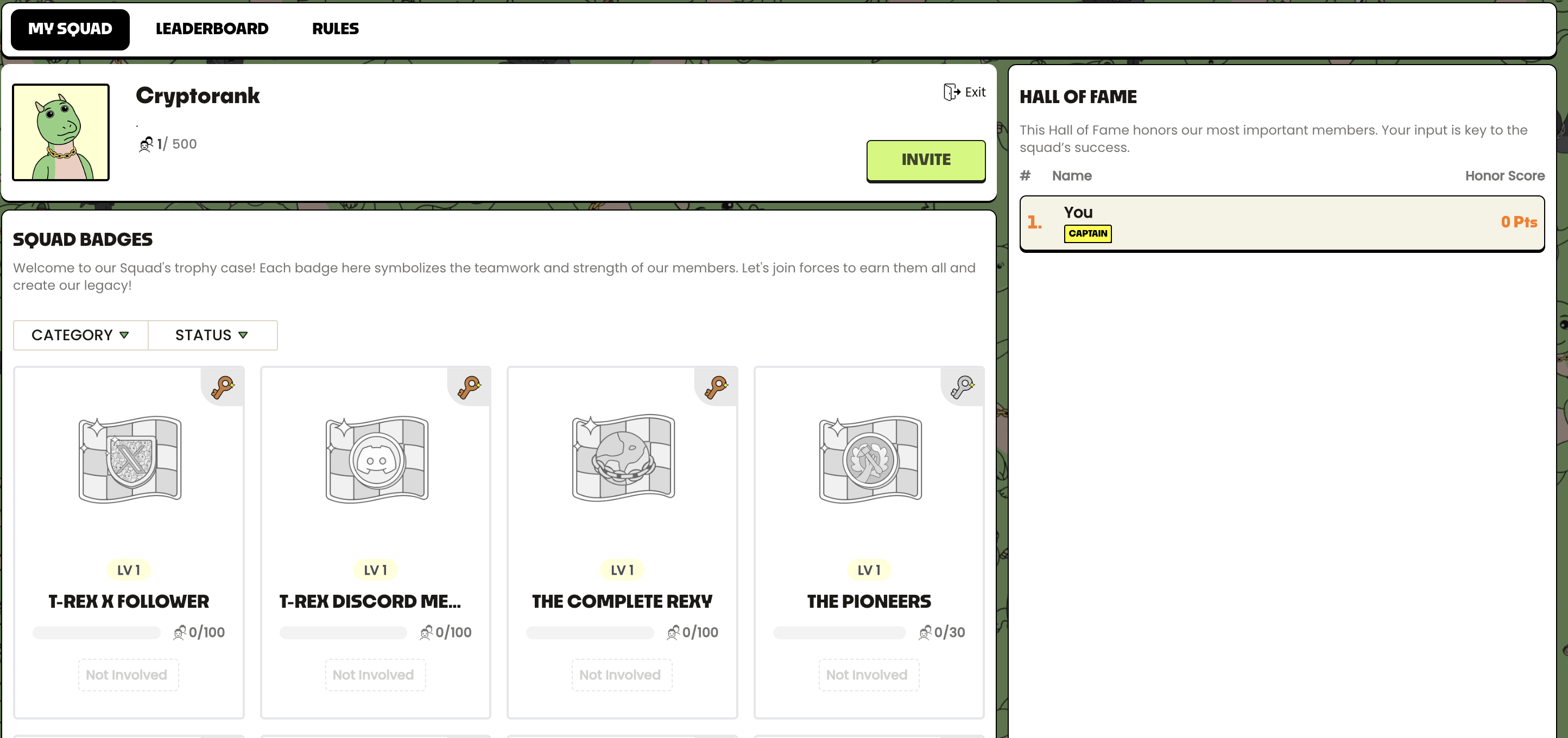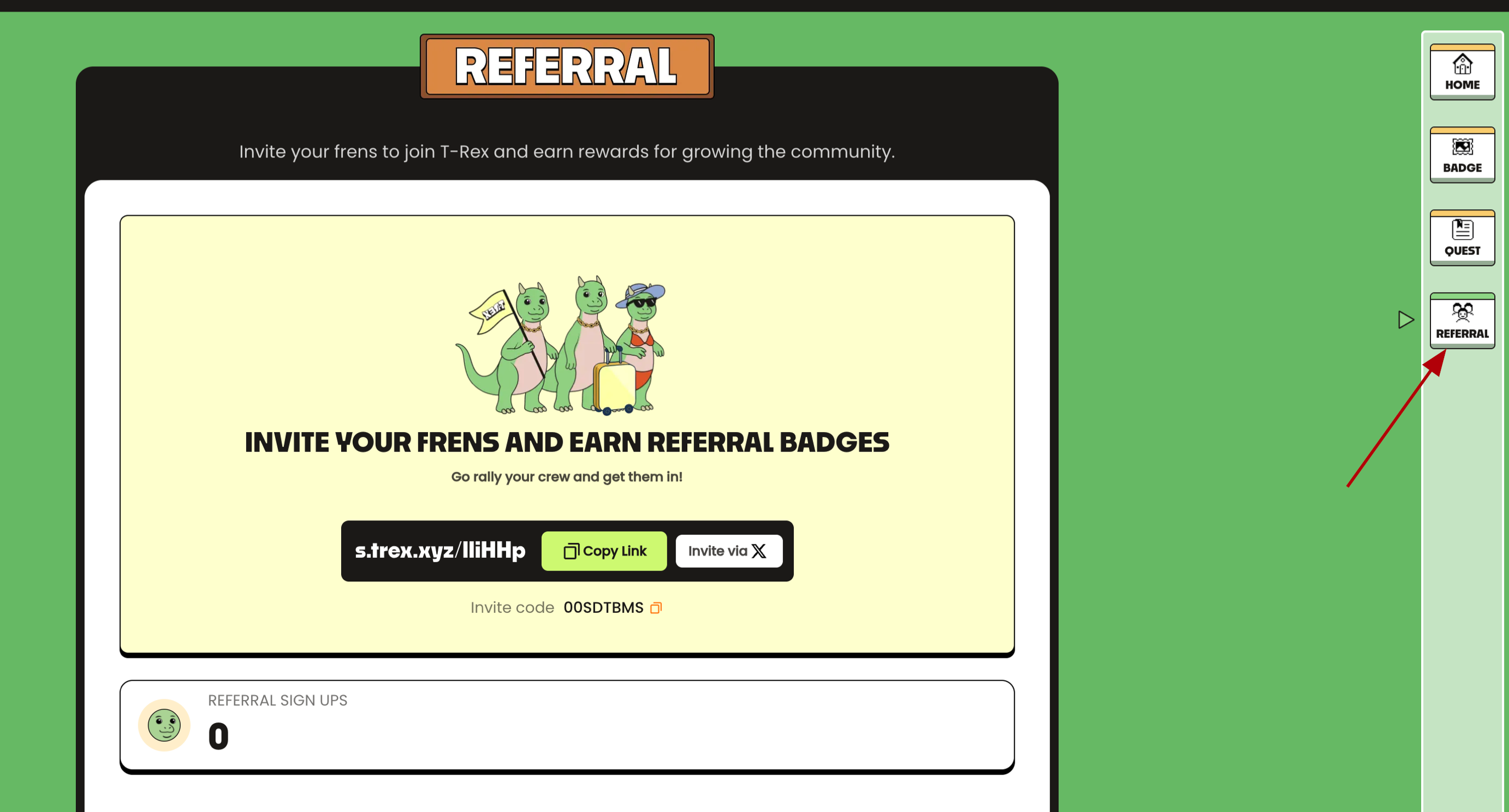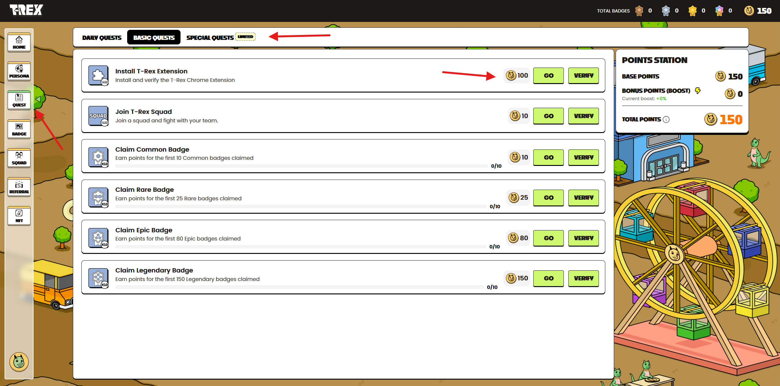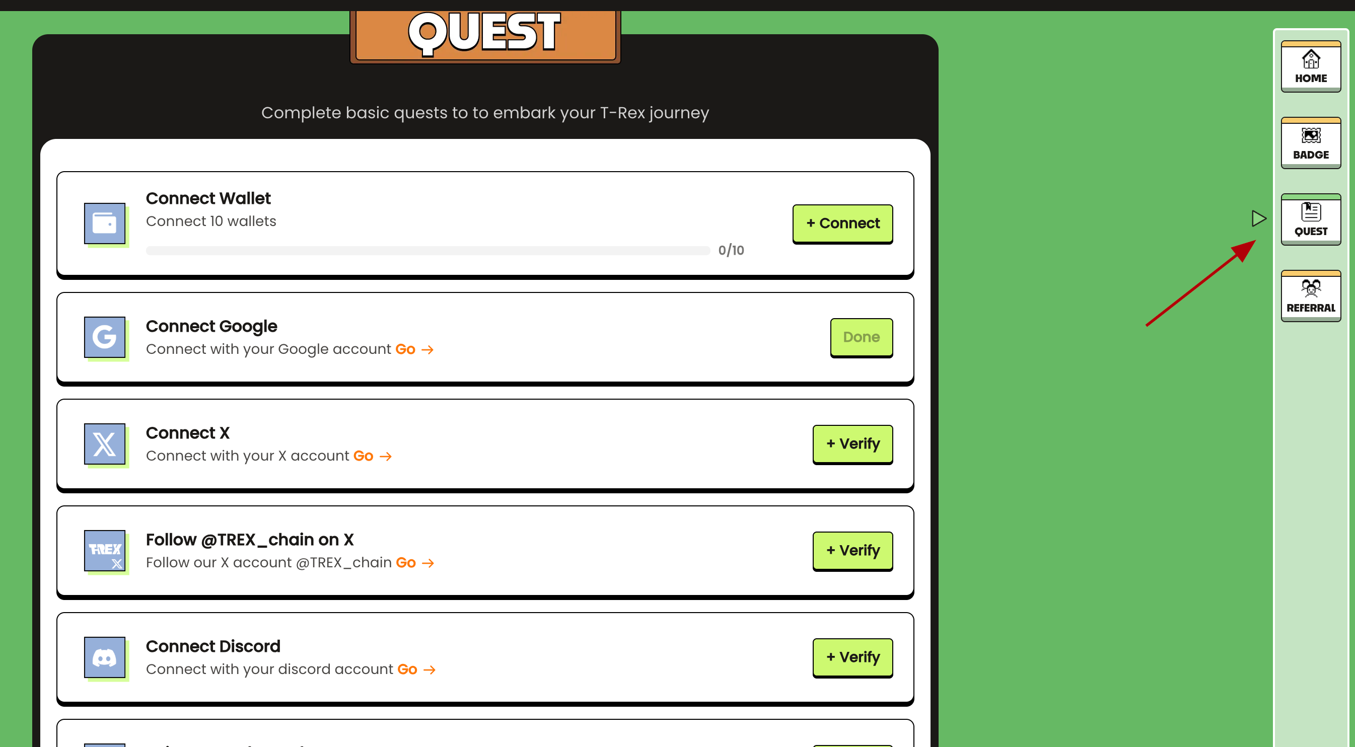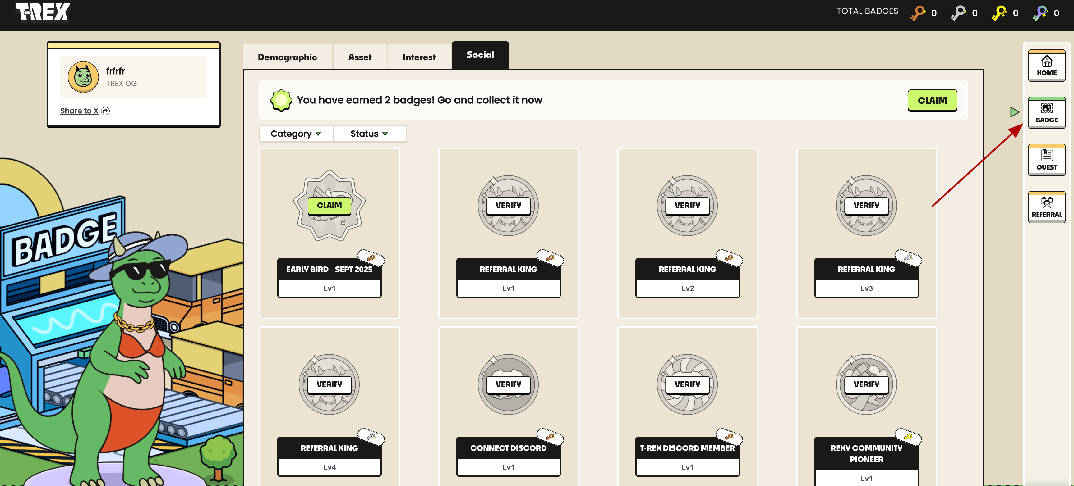 На сайте T-Rex появился раздел с бейджами и квестами. Мы можем выполнить их, чтобы претендовать на потенциальный аирдроп от проекта.