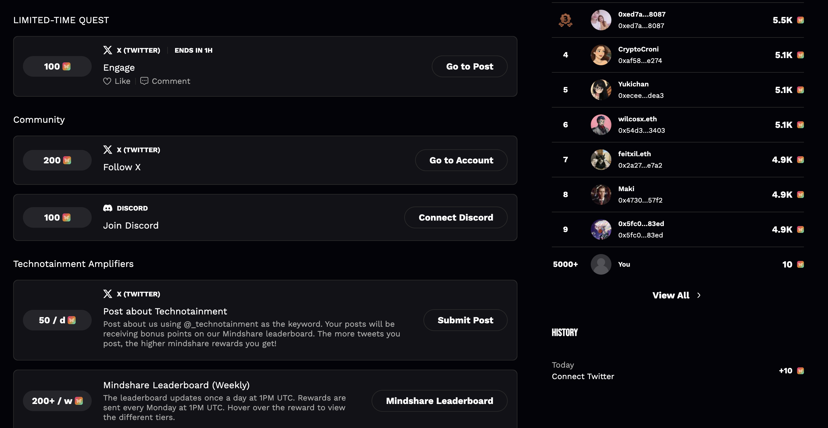 Technotainment запустили кампанию с призовым пулом $1M! Мы можем выполнить простые социальные задания, создавать контент с упоминанием контента и зарабатывать за это поинты. Чем выше вы будете в лидерборде, тем больше наград получите.