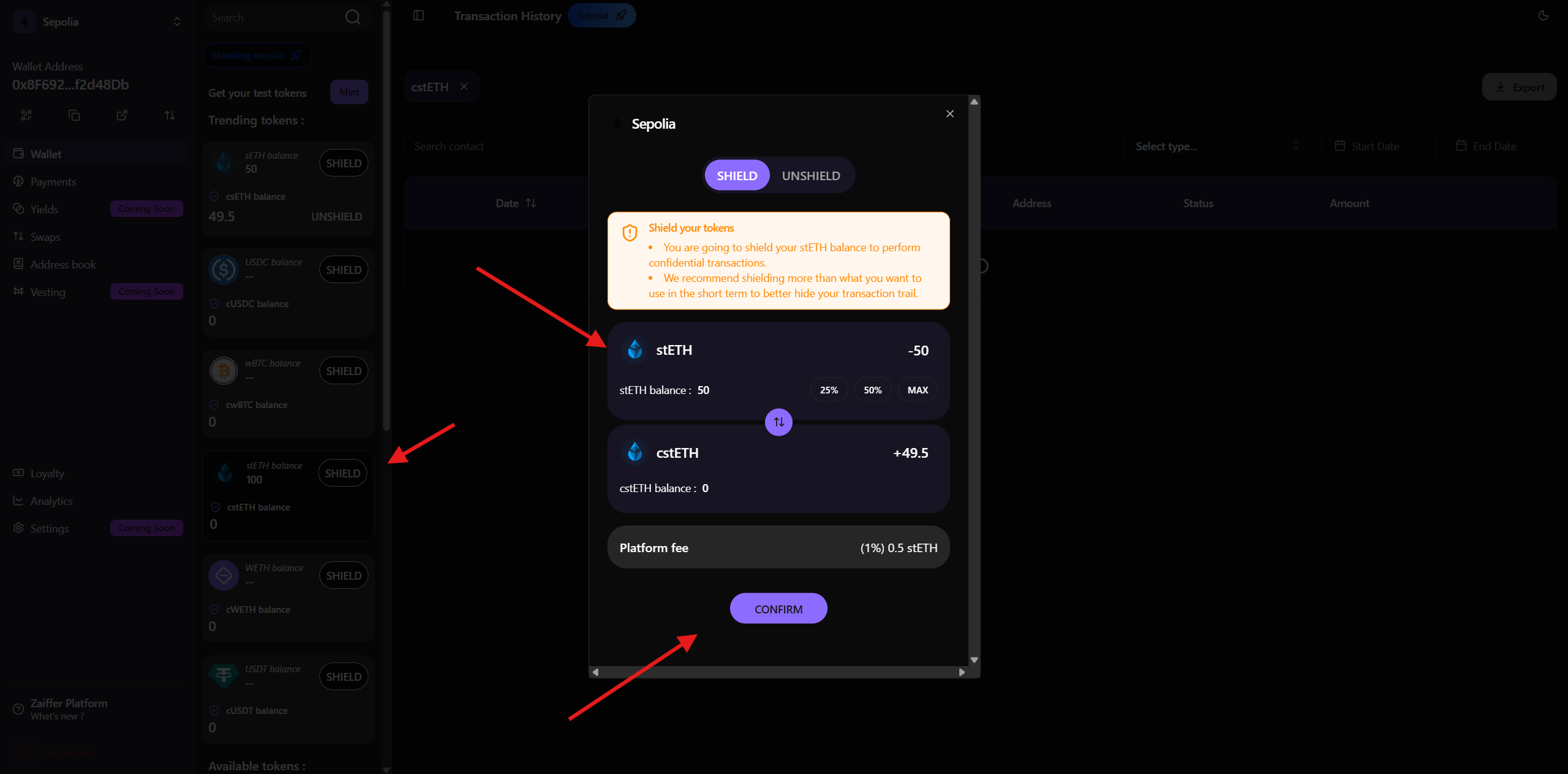 5. Переместите тестовые токены в защищенный контракт Shield.