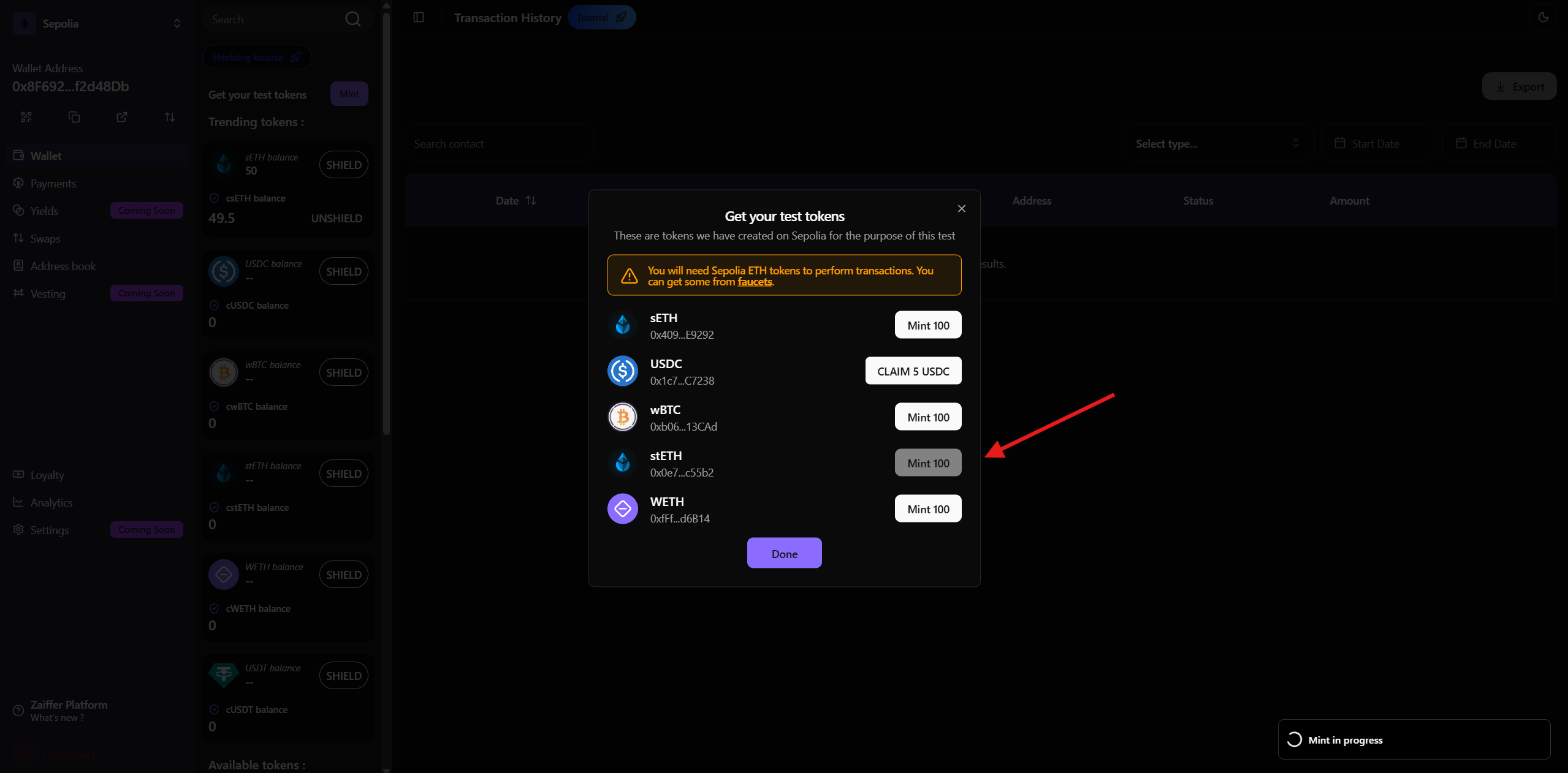 4. Сделайте Mint тестовых токенов. Обратите внимание на то, что вам нужен ETH в тестовой сети Sepolia для оплаты комиссий в тестнете.