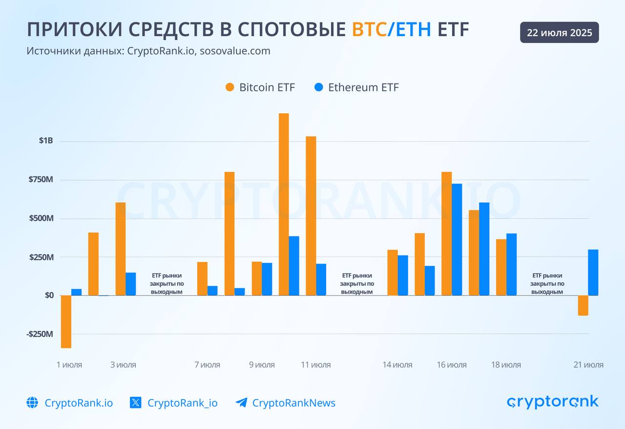Эфир обогнал Биткоин по притокам в спотовые ETF. Куда движется рынок?