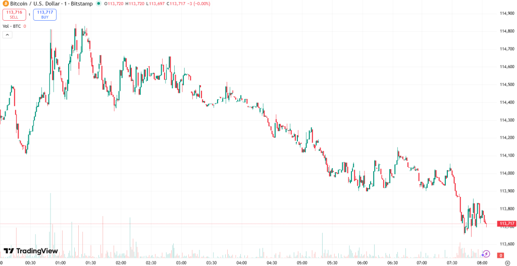 At the time of writing on Tuesday morning, BTC trades at $113,992. There was a notable surge earlier in the day from the low of $111,808 to the intraday high of $114,762. This is also the coin’s intraweek high.