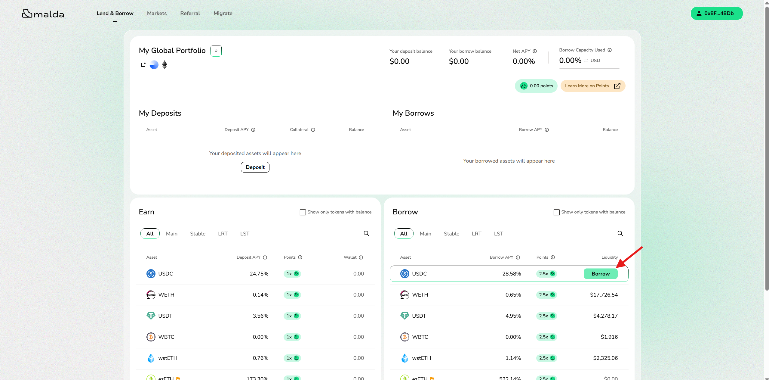 2. 借贷 - 在应用首页的“Borrow”部分,您可以在抵押的前提下进行借贷。每投入1美元的流动性,每天可获得2.5积分。如借入与存入相同的资产,每天仅可获得0.15积分。