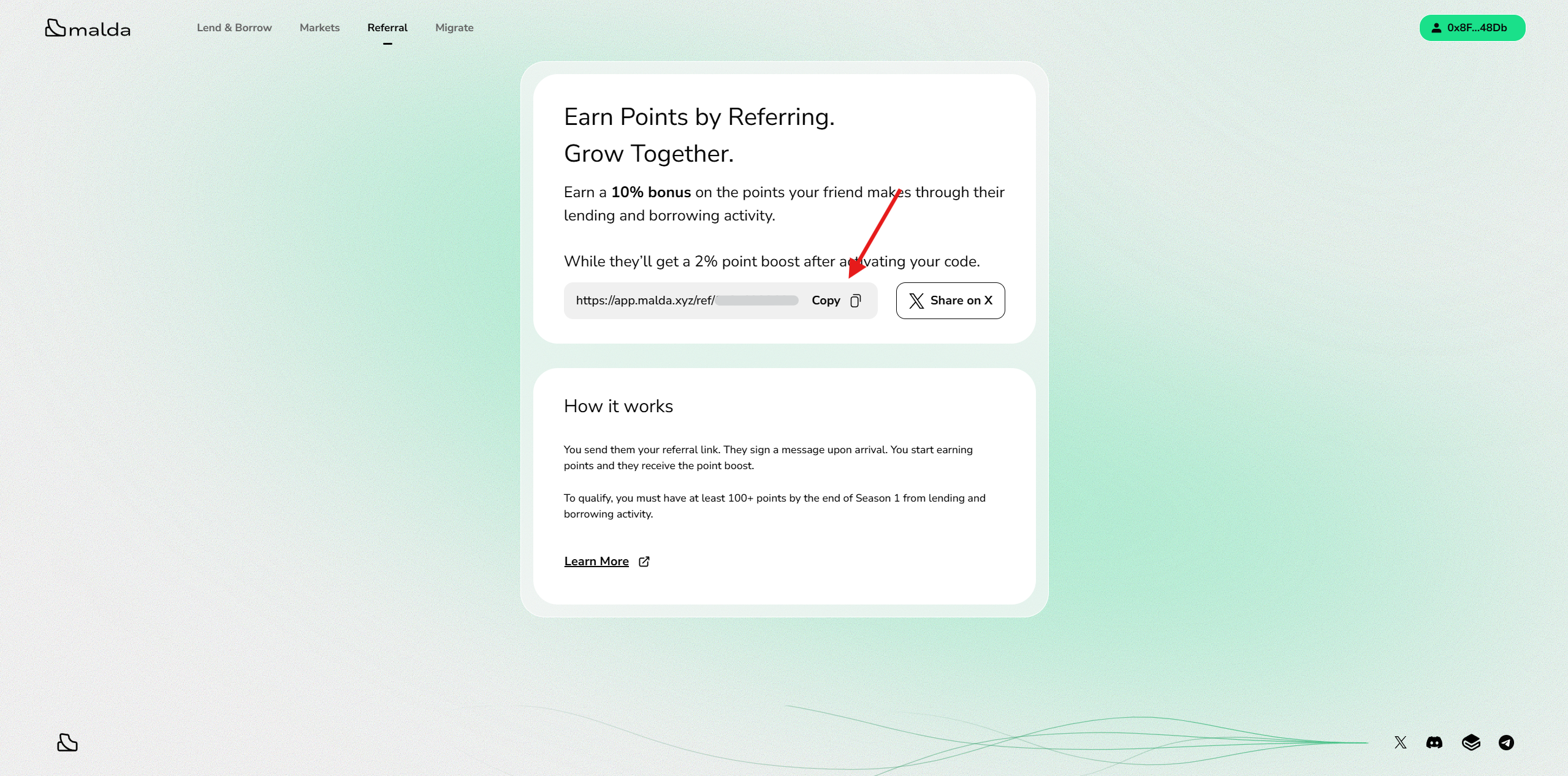3. 若要通过推荐获取积分,请在单独页面复制推荐链接并邀请用户。您将获得10%的推荐积分收益以及2%积分加成。